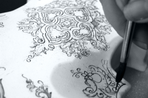 Le décorateur peint à main levée sur l'émail cru, en appliquant au pinceau des couleurs à base d'oxyde, une technique datant du XVIIIe siècle, qui permet la fusion complète du décor et de l'émail. Cette méthode de fabrication traditionnelle entraîne de légères variations en termes de couleur et de décoration. Le caractère entièrement artisanal du travail garantit que chaque pièce de faïence est unique.